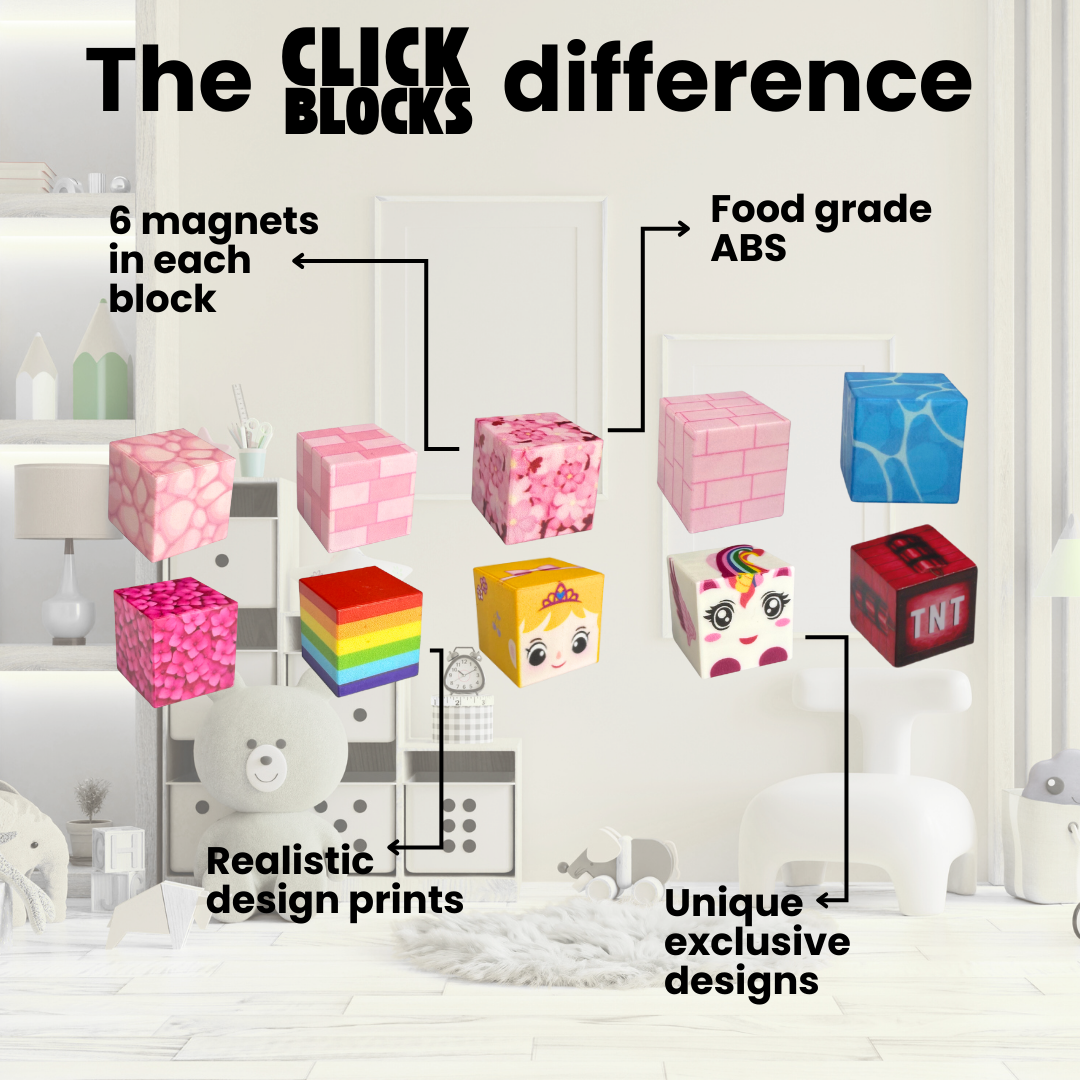 Click Blocks bring the fun from your screen to life. With our magnetic building blocks there are endless possibilities. You can build castles, houses, mountains, cars, trains, planes, anything. You name it, it is possible.