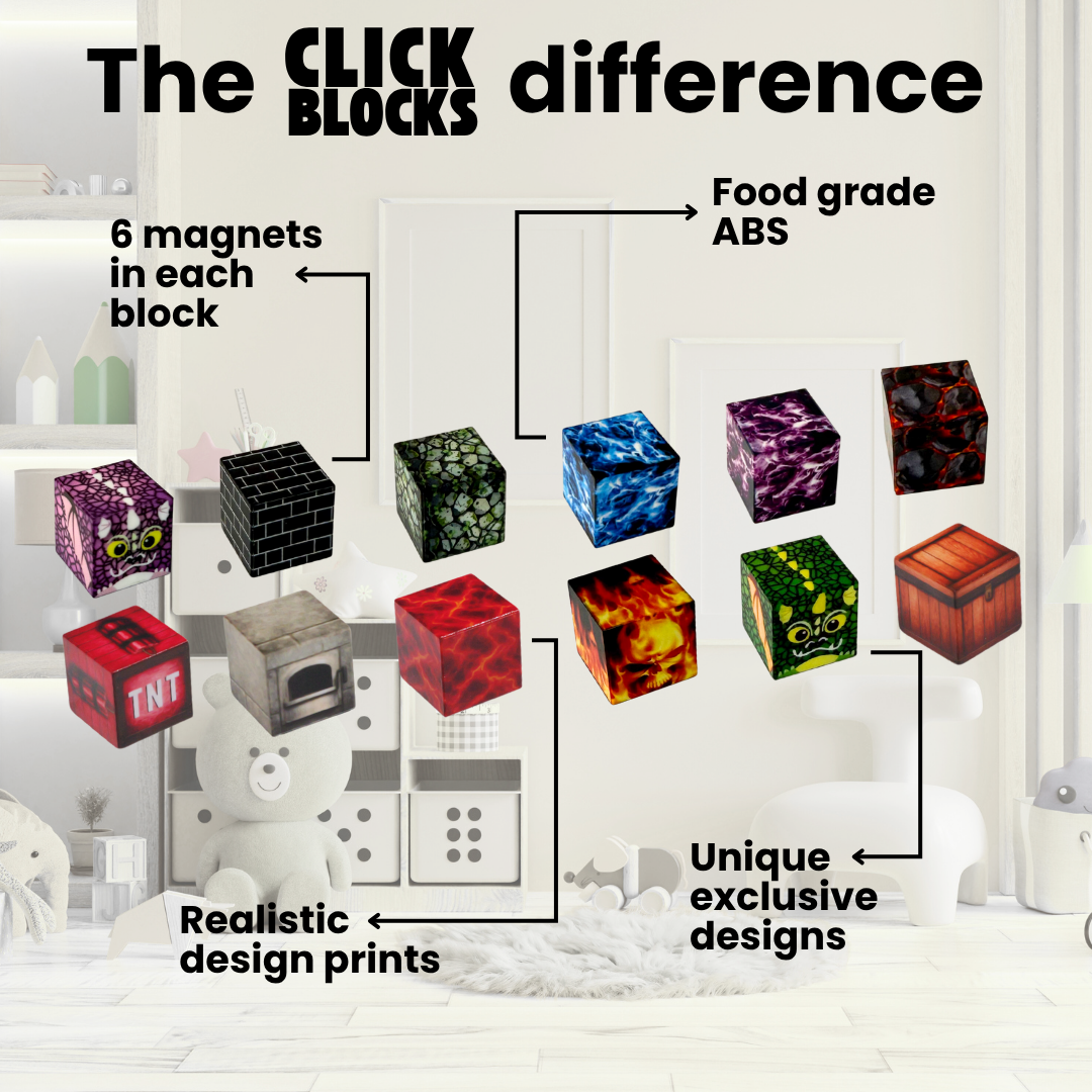 Click Blocks bring the fun from your screen to life. With our magnetic building blocks there are endless possibilities. You can build castles, houses, mountains, cars, trains, planes, anything. You name it, it is possible.